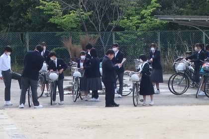 午後に行われる通学団会に向け、自転車点検が行われていました。整備の行き届いた自転車に乗ることは、マナーの第一歩です。