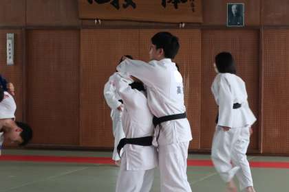 春から始まる様々な大会に向け、それぞれの得意技を極めていきます。卒業生も多く参加し、充実した稽古ができているようです。