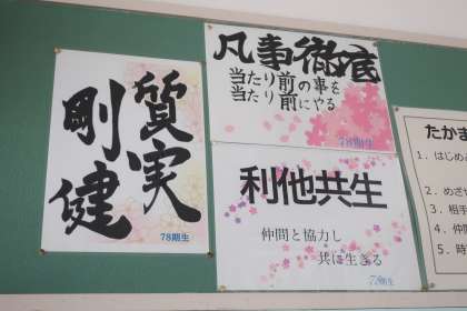 各教室に掲示されている校風・スローガン(合言葉)・校歌の3点セット。これらは、この3月に卒業した78期生が製作してくれたものです。