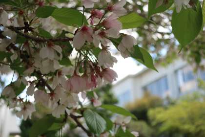 先日の暴風雨に耐えたサクラ。現在もまだ少し花は残っていますが、緑色の葉も勢いを増してきました。