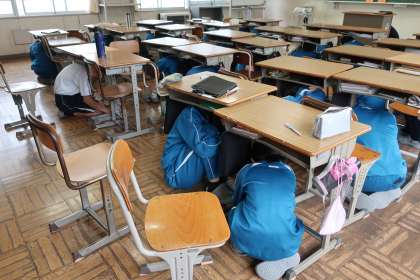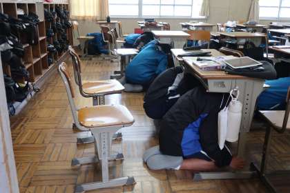 「訓練、訓練。地震が発生しました。・・・」の放送がかかるや否や、瞬時に机の下に身を隠す生徒たち。本当に素早い動きでした。