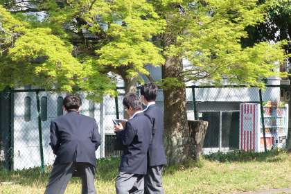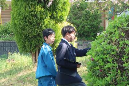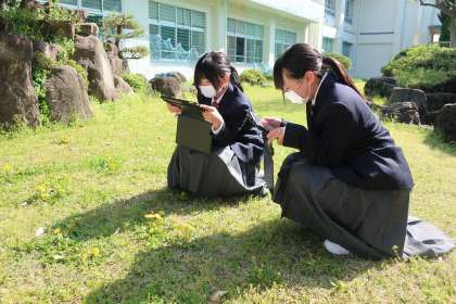 学習用タブレットを片手に、屋外で春の植物の観察を行っていました。
