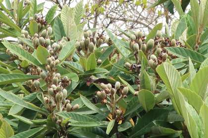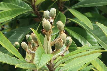 実はこれ、ビワの実です。ビワの実と言えば、薄いオレンジ色のものを想像すると思いますが、やはりでき始めは緑色。少し細長いですが、キウイフルーツのような表面をしています。