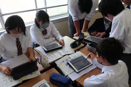塩化銅の電気分解の様子について、どのようなことが起こっているか自分の考えをもち、仲間と確認し合っていました。