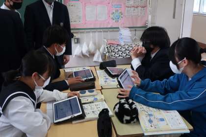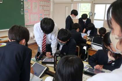 塩化銅の電気分解の様子について、どのようなことが起こっているか自分の考えをもち、仲間と確認し合っていました。