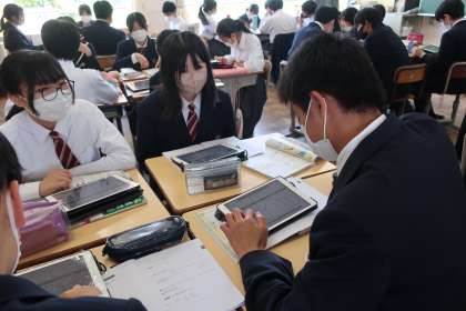 塩化銅水溶液の電気分解について、どのようなことが起こっているか自分の考えをもち、仲間と確認し合っていました。