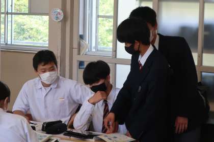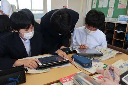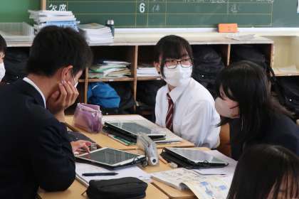 塩化銅水溶液の電気分解について、どのようなことが起こっているか自分の考えをもち、仲間と確認し合っていました。
