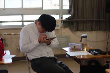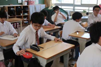 長さを調べる学習で、メジャーを片手に校舎内のあちこちの計測に出かけました。今回のお題は「1メートル」。2グループに分かれ、協力して活動していました。