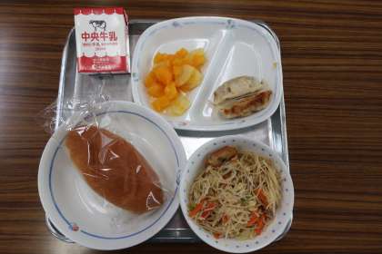 5/7 今日の給食 公開日 2025/05/07 更新日 2025/05/07 特別活動 今日の献立は ————— 炒めビーフン、ミックスフルーツ、ぎょうざ、米粉パン、牛乳 でした。 *エネルギー:807kcal たんぱく質:32.0g