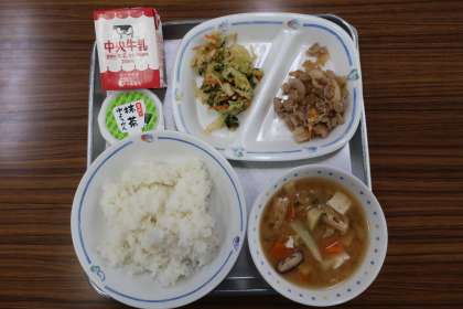 5/9 今日の給食 公開日 2025/05/10 更新日 2025/05/10 特別活動 今日は「豊田ブランドの日」献立です。 献立は ————— みそ汁、アーモンドあえ、とよたひまわりポークのしょうが炒め、抹茶水ようかん、ごはん、牛乳 でした。 *エネルギー:786kcal たんぱく質:30.0g