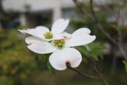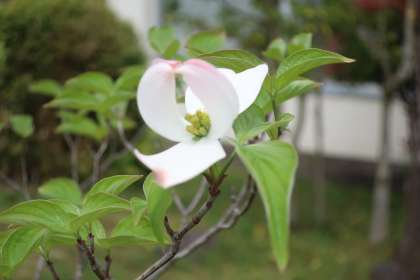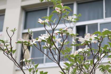 職員室南側に植わるハナミズキ。薄いピンクの花びらの先端には濃いピンク色の部分があり、見ていてとても心が和む花の一つです。