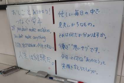 5/10 1年 学年教師のメッセージ 公開日 2025/05/10 更新日 2025/05/10 各学年から 各クラスに配付してほしいプリントや課題などの提出物を入れておく『集配ボックス』が1棟1階に設置されています。 1年生の集配ボックスの場所には、係の生徒へのねぎらいや読んでためになるメッセージが日替わりで更新されています。