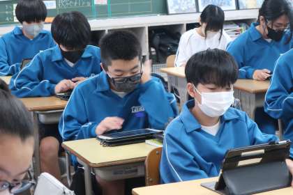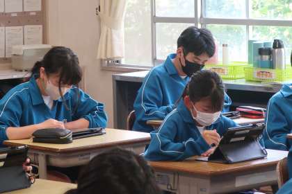 今回は「Qubenaタイム」ということで、学習用タブレットを使って5教科の学習に取り組んでいました。