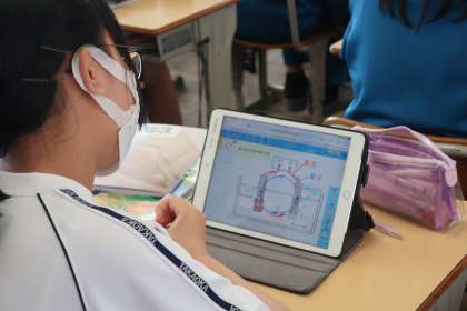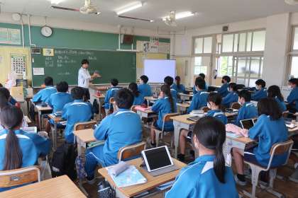 「塩化銅水溶液の電気分解のしくみを説明しよう」をテーマに学習に取り組んでいました。仲間の説明に真剣に耳を傾ける様子が印象的でした。