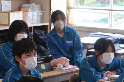 「塩化銅水溶液の電気分解のしくみを説明しよう」をテーマに学習に取り組んでいました。仲間の説明に真剣に耳を傾ける様子が印象的でした。