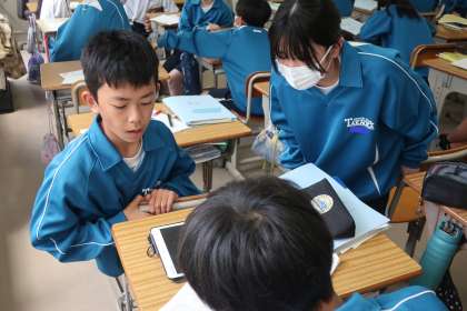 正の数・負の数が入った式の計算に取り組んでいました。仲間の発表に真剣に耳を傾け、正解するとは拍手がわくなど、とても良い雰囲気で授業に臨んでいました。