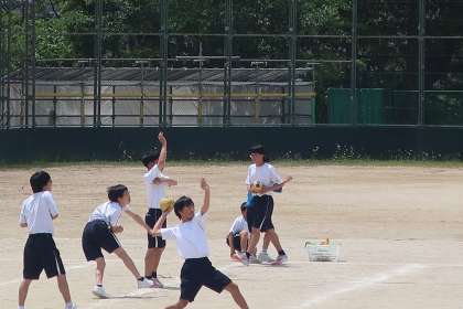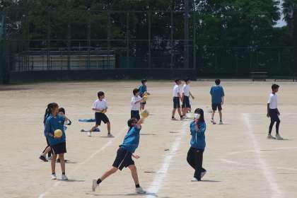 体力テストのハンドボール投げの記録の測定です。1年前の記録を更新しようと、必死に練習に取り組んでいました。