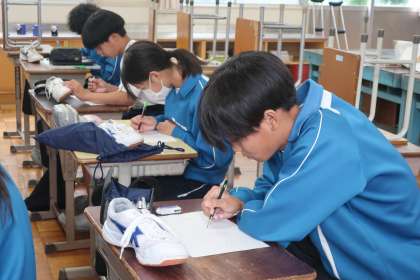スケッチの学習で、「体育館シューズの特徴をとらえよう」をテーマに、作品づくりに取り組んでいました。