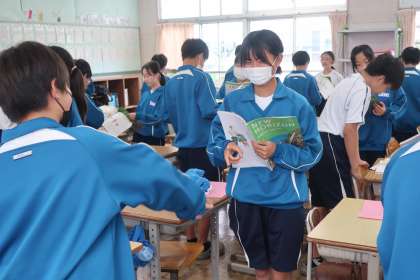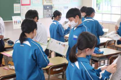 教科書本文の会話を役割を決めて、発音を意識して読み合っていました。