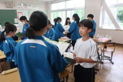 教科書本文の会話を役割を決めて、発音を意識して読み合っていました。