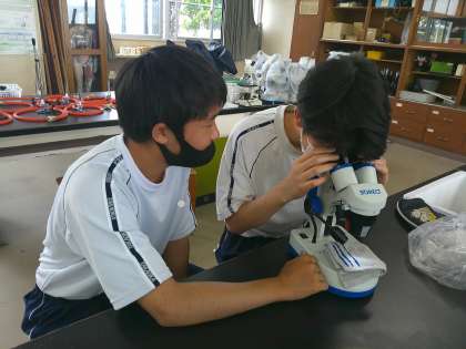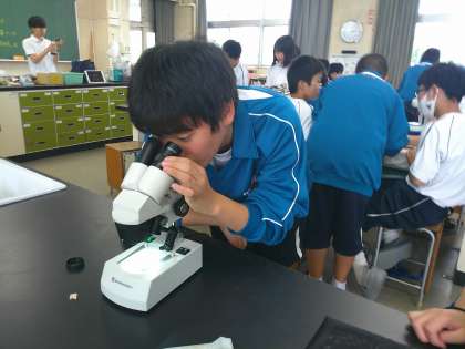 「理科室での決まりごと」を真剣に聞いたあと、双眼実体顕微鏡でハンカチやシャーペン、ほこりや髪の毛など、興味をもった物を観察していました。
