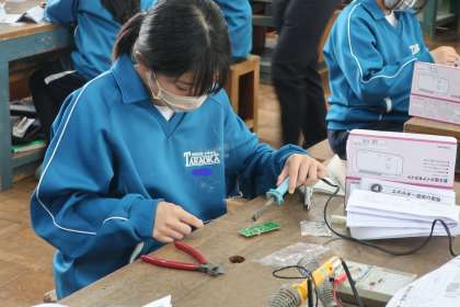 ダイナモラジオの製作で、電子回路に部品を取り付ける活動を通して、エネルギー変換のしくみも学んでいました。