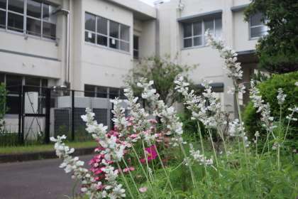 職員室南側の花壇に植わる紫色の花(写真上)… そう、ラベンダーです。