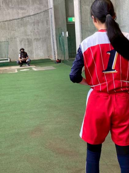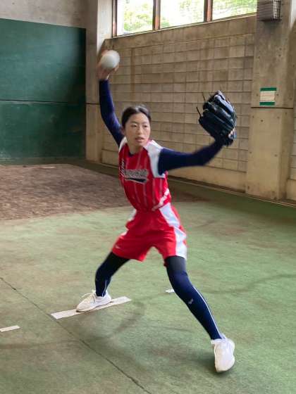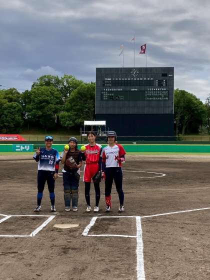 昨日、女子ソフトボールの実業団チームのリーグ戦が、豊田市運動公園野球場で行われました。そして、本校ソフトボール部のエースが始球式に登場し、見事、大役を果たしました。