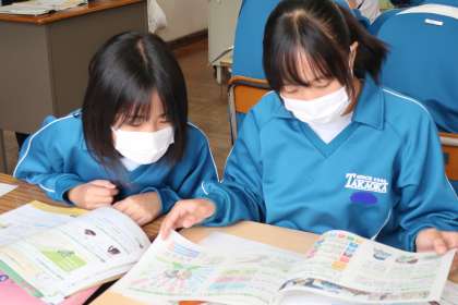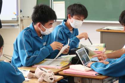 人や社会、環境のことをちょっと考えて、よりよい未来に向けて行う消費行動「エシカル消費」。消費者庁から出されているエシカル消費のチラシを読み込み、英語で伝えようとグループで取り組んでいました。