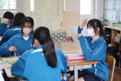 人や社会、環境のことをちょっと考えて、よりよい未来に向けて行う消費行動「エシカル消費」。消費者庁から出されているエシカル消費のチラシを読み込み、英語で伝えようとグループで取り組んでいました。