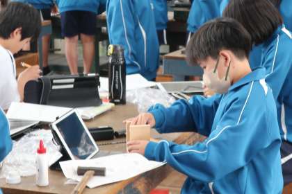 1年4組の技術科の授業の様子です。 木製品「融合ボックス」づくりに取り組んでいました。
