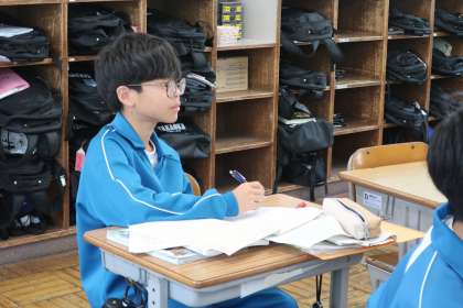 ことばのきまりの学習で、単語の区切り方を身につけるため、文節の区切り方をしっかり確認していました。