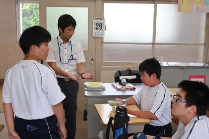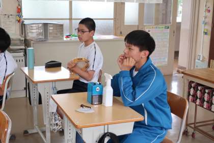 重さの学習で、各自が選んだ二つの身近な物を実際に手に取り、その重さを予想していきます。出題者と解答者に分かれた対抗戦で楽しみながら学習に取り組んでいました。
