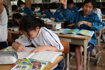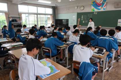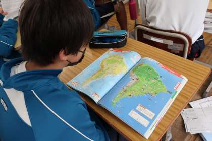 地図帳に味方について学んだあと、「地図グランプリ」で盛り上がっていました。地図にもっと親しんでもらおうという思いから、出題も生徒が行います。今後定期的に開催されるようです。