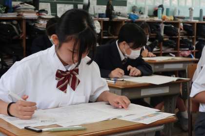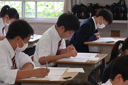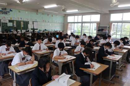 1年1組の第1回定期テスト(初日)の様子です。