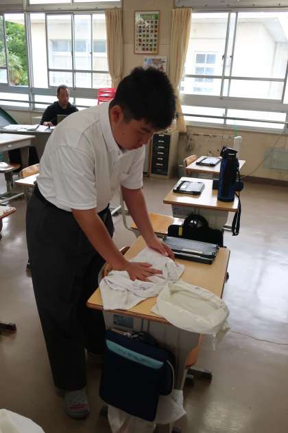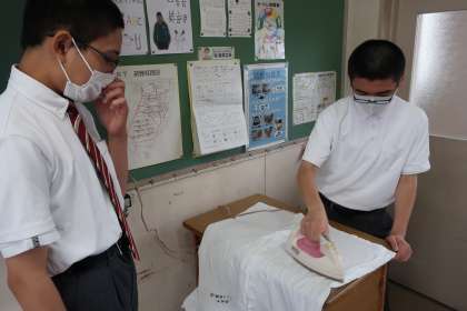月曜日の最初の授業は、給食のエプロンのアイロンがけです。仲間と協力して、自分たちで活動を進めています。