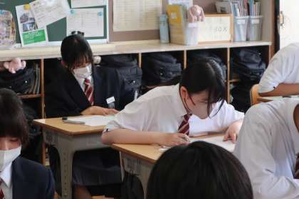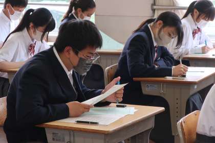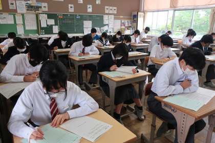 3年3組の第1回定期テスト(初日)の様子です。