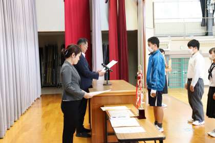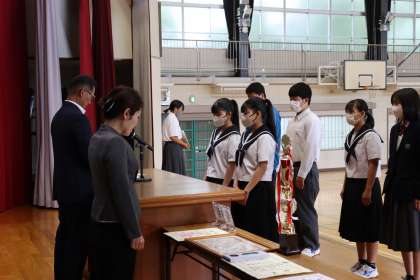 部活動の春の大会をはじめ、学校外の活動で優秀な成績を収めた生徒たちに、校長先生から表彰状の伝達があり、全校生徒の前で披露されました。