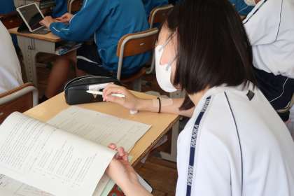 定期テストが返却され、解説を聞いた後、テスト直しに取り組んでいました。