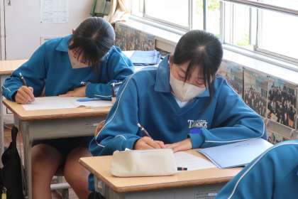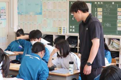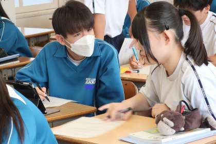 「平方根の大小を比較しよう」をテーマに、解き方を仲間にも丁寧に教えていました。
