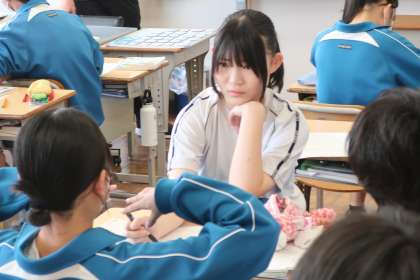 「平方根の大小を比較しよう」をテーマに、解き方を仲間にも丁寧に教えていました。