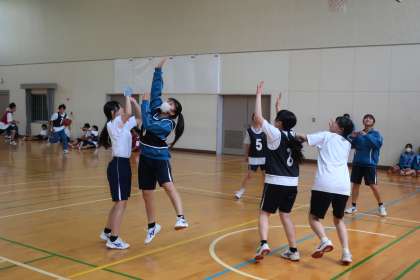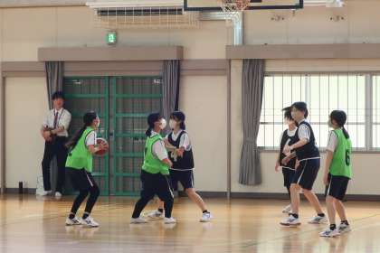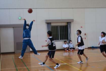 バスケットボールの学習で、ゲームを通して「チームで力を合わせ、ノーマークをつくろう」をテーマに迫っていました。