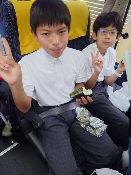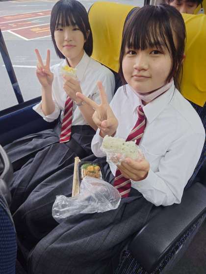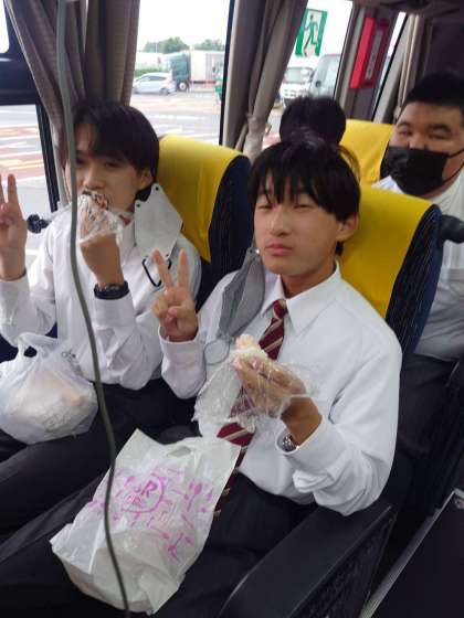 クラス別研修を充実させるため、移動のバス内で昼食タイムです。