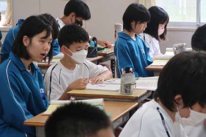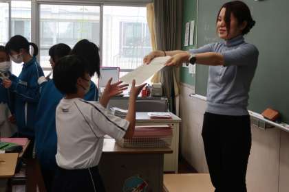 単元のまとめのテストが返却され、「学習に向かう姿勢が素晴らしい」と声をかけられ、その後のリピートの活動も元気よく取り組んでいました。
