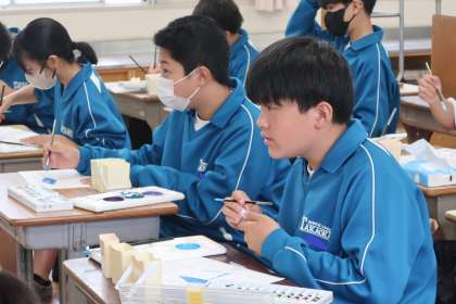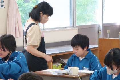 「絵の具の具合と平塗りの仕方、片付け方をマスターしよう」をテーマに、作品づくりの基礎を学んでいました。