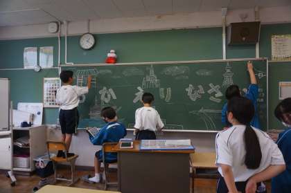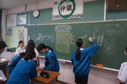 3年生が修学旅行に出かけてる間、1年生が黒板メッセージを作成していました。