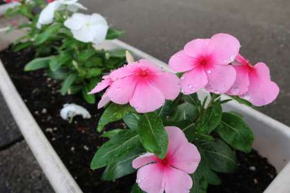 校舎和まりに配置されたプランターや花壇には、夏の花「ニチニチソウ」が植えられています。鮮やかではっきりとした花の色とつやのある葉が見る人を魅了しています。