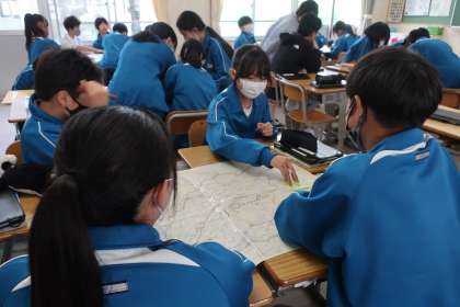 「古代の豊田の人々は、どのようなくらしをしていたのか」をテーマに、グループで地図に載っている遺跡の位置から、当時のくらしを考えていました。