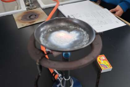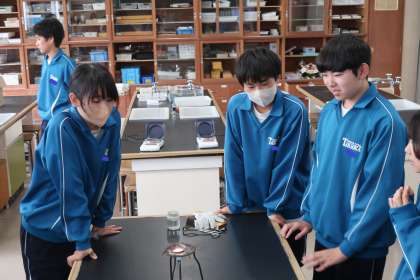 「金属を熱したときの質量の変化」を調べる実験に取り組んでいました。マグネシウムが熱せられる様子をじっと見つめる生徒たちが印象的でした。