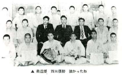 部長は中野剛先生で、現駒場小学校長。副部長は古沢喜知治先生で、現保見中学校教頭をされている。戦後6年目であり、生徒の士気を高め、質実剛健な生徒の育成には柔道がよいと、郡内で最初に発足した。よって、最初から礼を重んじると同時に、練習もハードなものだった。学校では朝、昼、授業後の練習と、安城農林、刈谷、岡崎工業などの高校へ出かけ、また夜は、知立市牛田、刈谷市今川の町道場で一般の人の胸を借りる毎日だった。レベルも急速に上がり、西三大会優勝、県大会3位といった好成績が続いた。とにかく先輩がいなかっただけに、先生も基礎作りに大変だったと思われる。発足して25年になる。多くの後輩が同じ道を経て社会人になっている。柔道の体験が有形、無形の形でプラスしていること計り知れないと思う。